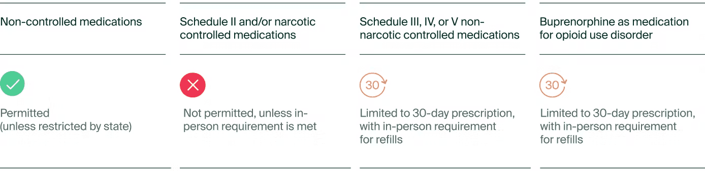 A DEA oferecerá uma disposição permitindo que os praticantes de telemedicina prescrevam um suprimento de 30 dias de uma substância controlada não narcótica da Classe III-V ou buprenorfina para OUD sem uma avaliação inicial presencial. No entanto, qualquer renovação ou prescrição em maior quantidade exigirá uma consulta presencial.